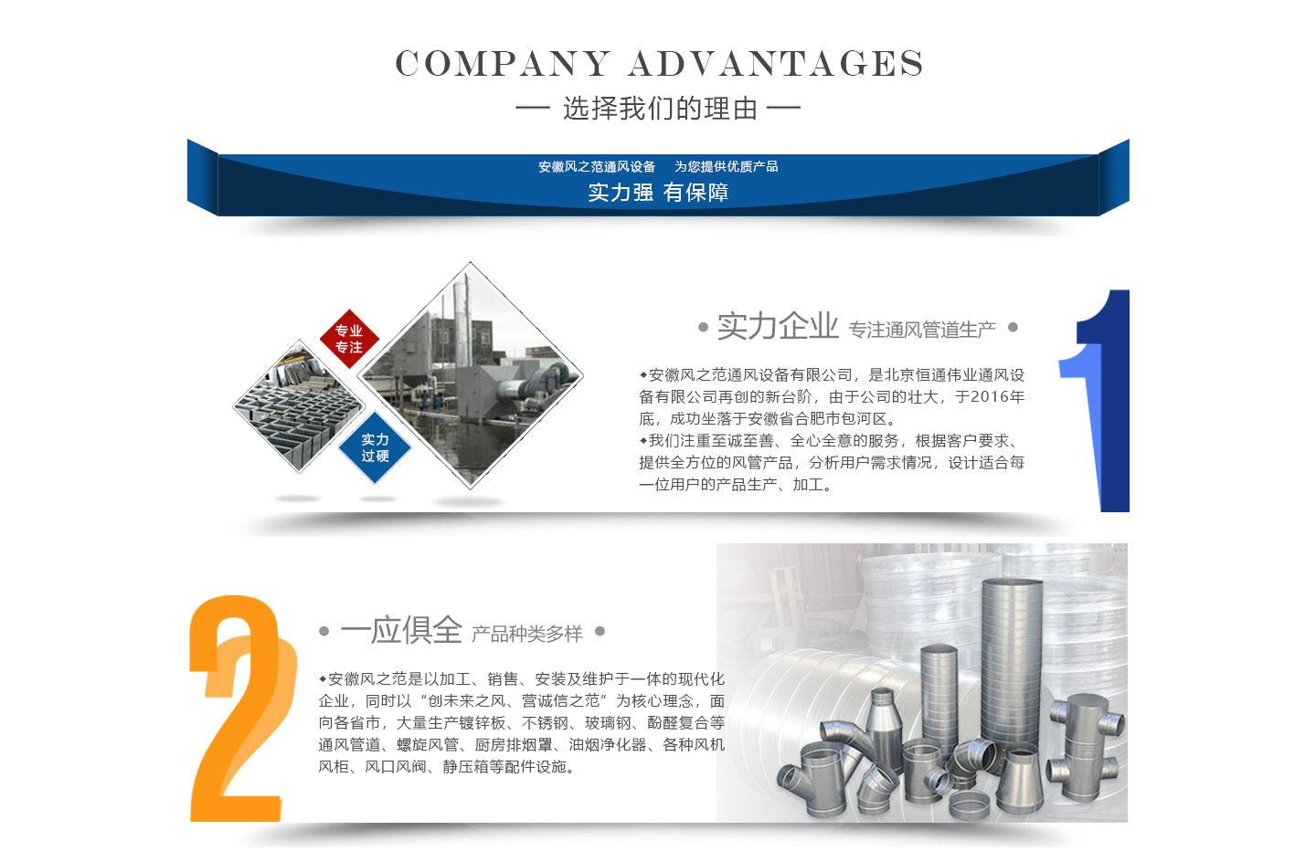 安徽風之范通風設備有限公司,是北京恒通偉業(yè)通風設備有限公司再創(chuàng)的新臺階,多年來,公司員工憑著“誠信敬業(yè)、團結拼搏、勇于開拓、務實進取”的企業(yè)精神,先后承接了多項重點工程項目,使公司健康穩(wěn)步發(fā)展。現(xiàn)由于公司的壯大,業(yè)務的拓展,又于2016年底,成功坐落于安徽省合肥市包河區(qū)。本公司生產設備精良,技術力量雄厚,質保體系完善!讓用戶體驗到,貼心的服務,無憂的售后!風之范是以加工、銷售、安裝及維護于一體的現(xiàn)代化企業(yè),同時以“創(chuàng)未來之風、營誠信之范”為核心理念,面向全國各省市,大量生產鍍鋅板、不銹鋼、玻璃鋼、酚醛復合等通風管道、螺旋風管、廚房排煙罩、油煙凈化器、各種風機風柜、風口風閥、靜壓箱等配件設施。廣泛承接商場、工廠、酒店、寫字樓、地下室等,消防排煙工程、除塵凈化工程、室內通風工程、暖通空調工程、廚房排煙凈化工程。我們力求上進,追求,歡迎各界人士技術指導,經濟合作,共創(chuàng)美好明天!